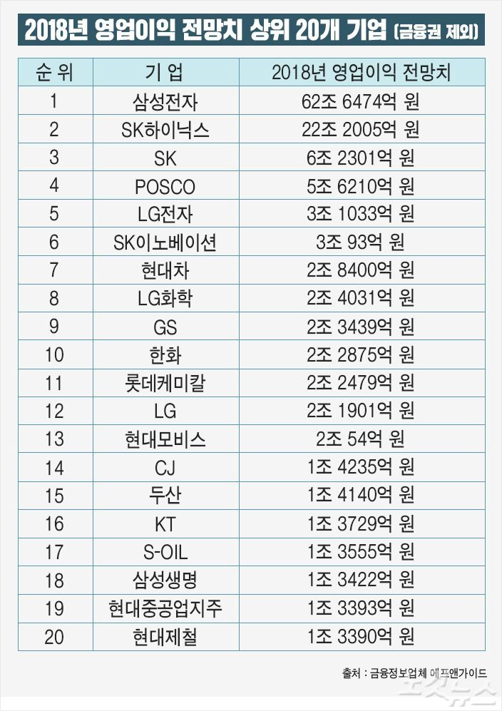 삼성전자와 SK하이닉스는 나란히 반도체 실적 덕분에 각각 영업이익 62조 6474억원과 22조 2005억 원을 거둬들일 것으로 보인다. SK(6조 2301억 원), POSCO(5조 6210억 원), LG전자(3조 1033억 원), SK이노베이션(3조 93억 원)이 뒤를 이었고, 2조 대 영업이익이 전망되는 기업도 7군데다.